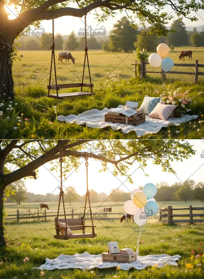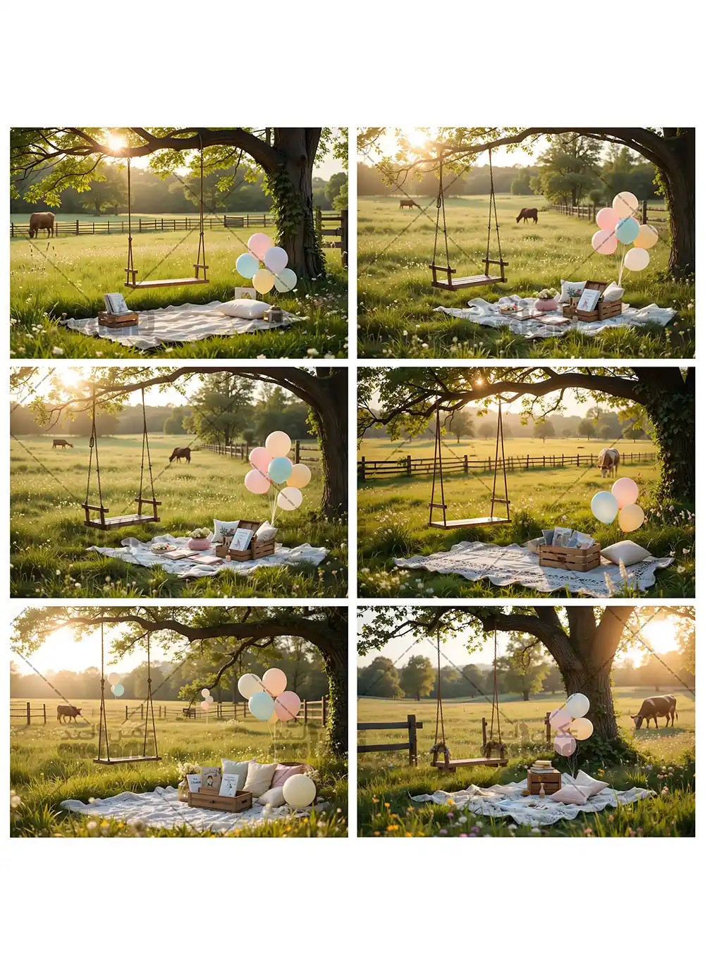 این بک گراند طبیعی و زیبا با طراحی مزرعهای آرامشبخش، فضایی رویایی برای ثبت لحظات خاص تولد دختران فراهم میکند. تاب چوبی آویزان از درخت، همراه با پتوی سفید نرم و بادکنکهای رنگی، ترکیبی هماهنگ و چشمنواز ایجاد کرده است. نور گرم غروب آفتاب در پس زمینه، به همراه منظره طبیعی مزرعه و اسبهای در حال چرا، عمق خاصی به تصاویر میبخشد که برای عکاسی کودک و جشن تولد بسیار مناسب است.
